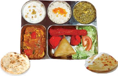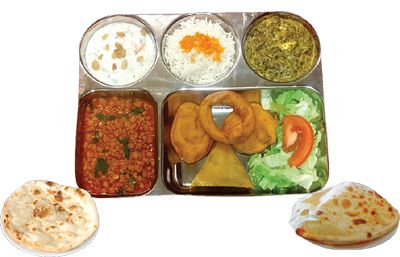 Beignets d’aubergine Beignets de pomme de terre Samosa légumes Raïta Dal makhani et Palak panner + Naan nature + Riz basmati Supplément Naan fromage : + 2,50 € |